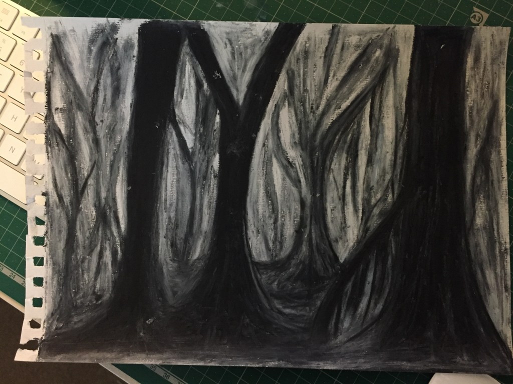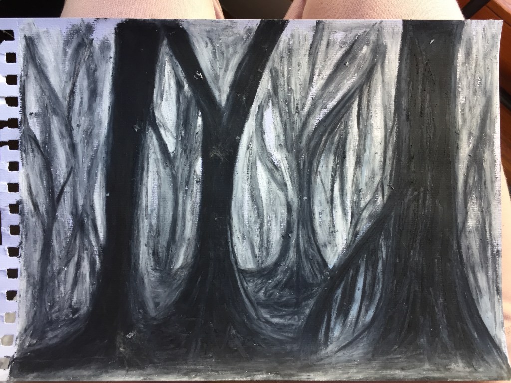 I used yesterday and today to work on the background. Yesterday, I drew up a dark forest scene using copic markers, pastels and pencils.