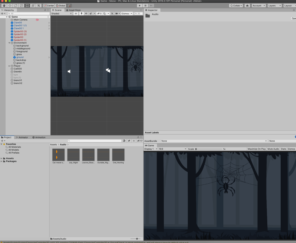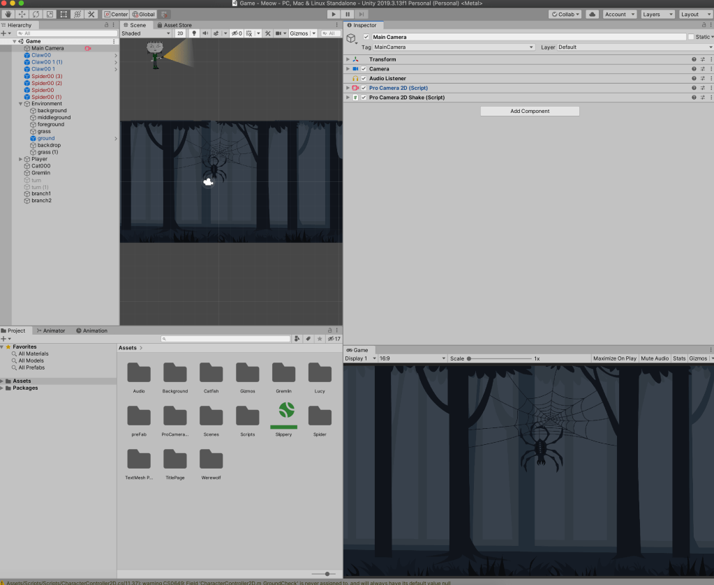 So I resolved the enemy issue, so no pushing of enemies into holes anymore. The enemy is killing me yay! As you can see my Gremlin just has another collider. The box collider is for keeping him on the ground and the other is the collision with my player. whoop whoop. I do however have to come up with a better ending cause yeah it is not working so lekker. But that means creating some more assets which I will do tomorrow.